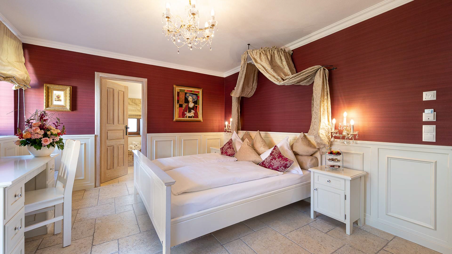 LAGE: im 1. Stock FRÜHER: Heustadl über der Scheune GRÖSSE: 24 qm - Zimmer 18 qm, Bad 6 qm FARBEN: Weiß, dunkelrot, gold AUSBLICK: Rückseite Wohnhaus Sixtwiesen MERKMALE: Herrschaftliches Zimmer mit Kronleuchter und weißen Möbeln, Doppelbett mit Fußteil mit den Maßen 2,00m x 1,80, Schreibtisch, kleiner Schrank, Ledersessel, Boden aus ägyptischem Sandstein, Bad mit Tageslicht GEMÄLDE: Blumen Aquarell von Dr. János Kadnár 1897 - 1982 - Kleines Blumenbouquet im dicken Goldrahmen von Eugen Osswald 1879 - 1960