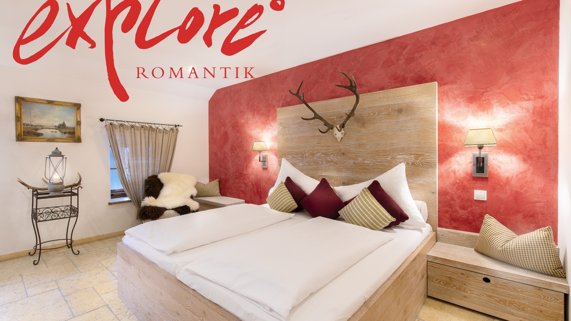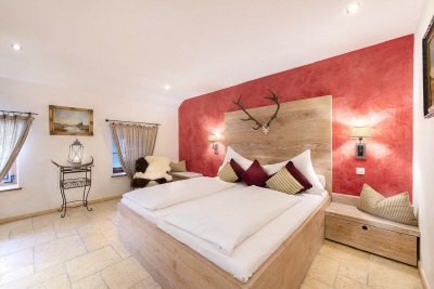 LAGE: im 1. Stock FRÜHER: Schlafzimmer Bauersfamilie GRÖSSE: 23 qm - Zimmer 18 qm, Bad 5 qm FARBEN: Weiß, rot AUSBLICK: Chalet-Eingang MERKMALE: Stylisches Zimmer, Doppelbett ohne Fußteil mit den Maßen 2,00m x 1,80m, Hirschgeweih über dem Bett, kleiner Schreibtisch, Minibar, Sitzfläche an Wand, Boden aus ägyptischem Sandstein, Bad mit Tageslicht GEMÄLDE: "Auerhahn" von R. Hirschel - "Hochgebirge" von L. Stierstorfer Nürnberg - "Voralpenlandschaft" von S. Burghofer München