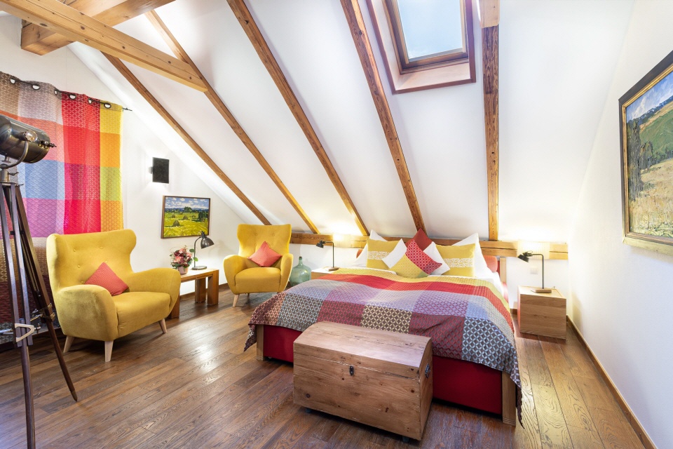 LAGE: im 2. Stock FRÜHER: Luftraum über Scheune - Lagerraum von Getreide GRÖSSE: 35 qm - Zimmer 30 qm, Bad 5 qm FARBEN: Weiß, rot, viel Holz AUSBLICK: Wohnhäuser der Sixtwiesen MERKMALE: Gemütlich-elegantes Zimmer mit Fachwerk und Dachbalken, Doppelbett ohne Fußteil mit den Maßen 2,00m x 1,80m, großer Schreibtisch, Sitzbank, Holzboden aus antiker Eiche, Safe, Minibar, Bad mit Tageslicht GEMÄLDE: 5 Ölgemälde von Alexei Chustotchko