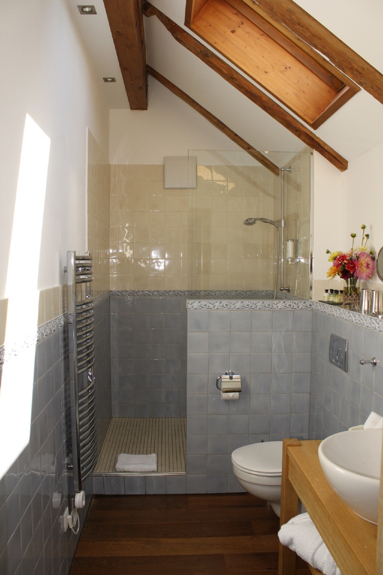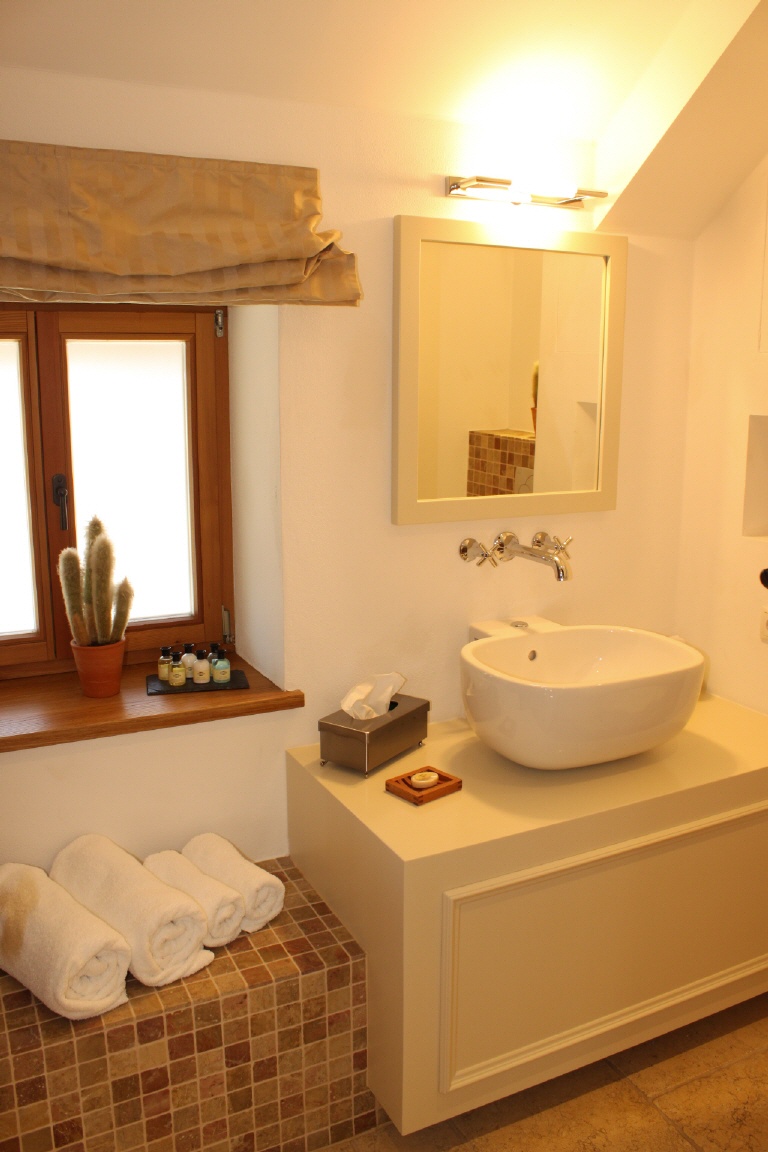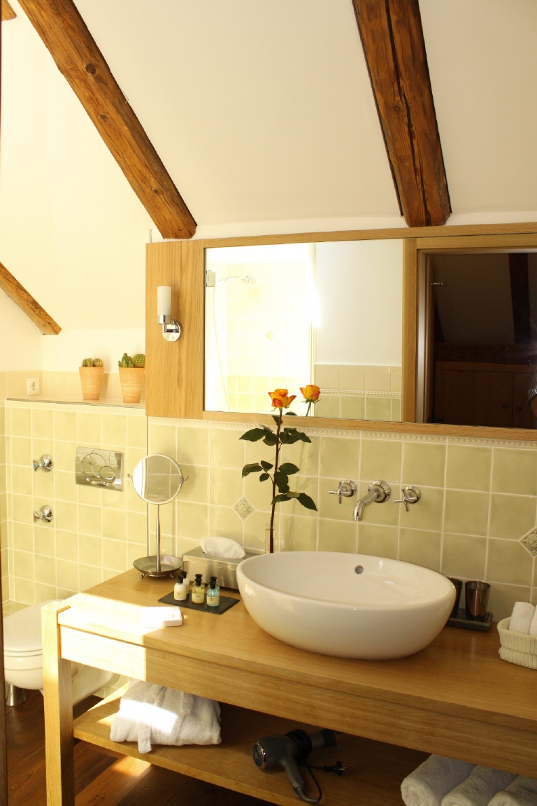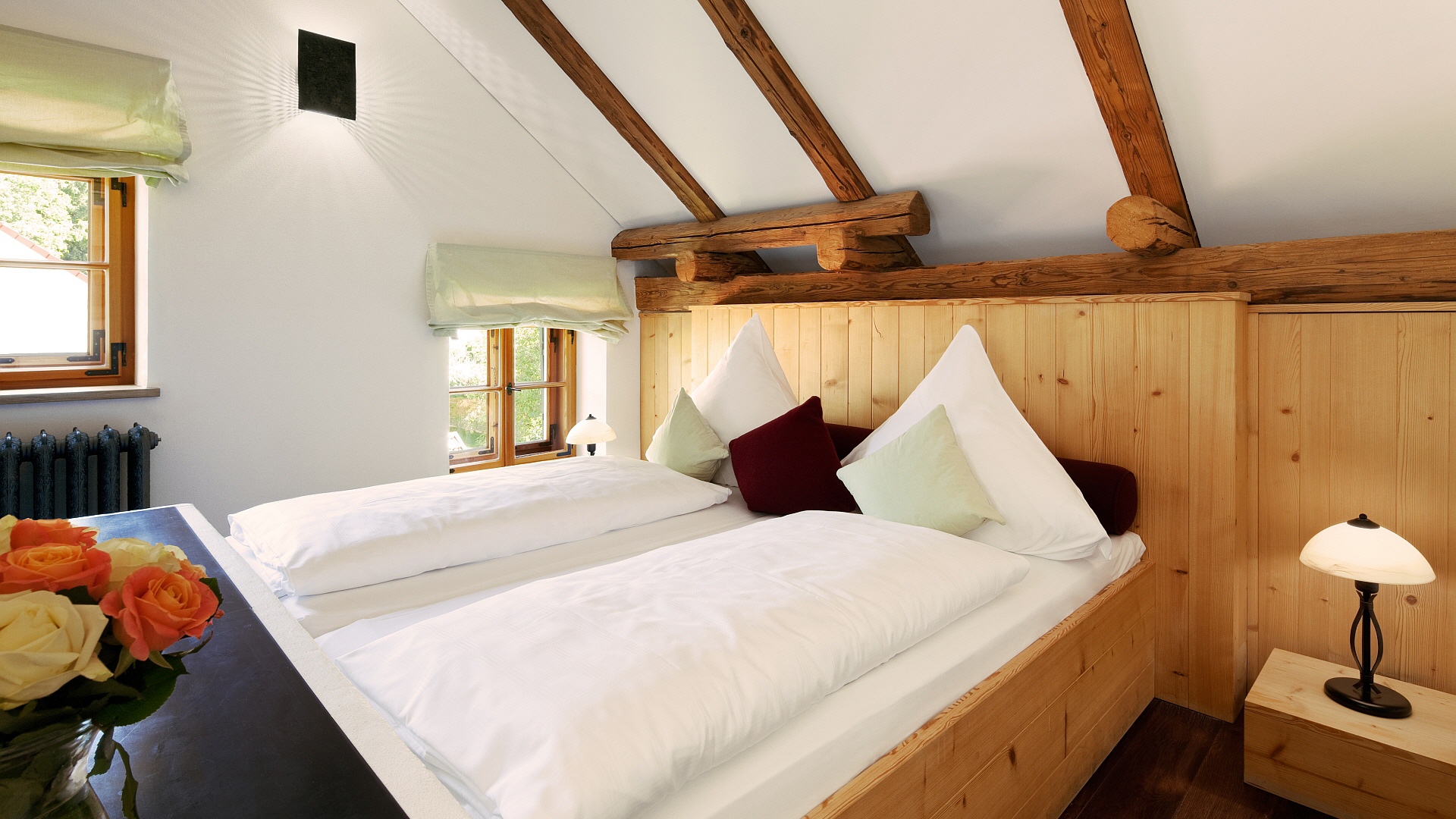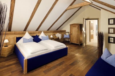 LAGE: im 2. Stock FRÜHER: Luftraum über Scheune - Lagerraum von Kräutern und Getreiden GRÖSSE: 30 qm - Zimmer 25 qm, Bad 5 qm FARBEN: Weiß, blau, viel Holz AUSBLICK: Zur Bäckerei MERKMALE: Gemütliches Zimmer mit Fachwerk und Dachbalken, Doppelbett ohne Fußteil mit den Maßen 2,00m x 1,80m, kleiner Schreibtisch, kleiner Bauernschrank, Holzboden aus antiker Eiche, Safe, Minibar, Couch geeignet als Extrabett, Bad mit Tageslicht GEMÄLDE: Zwei Ölgemälde von P. Reinegger - Zwei naive Gemälde von Ljudmilla Shemelowa - Segelschiffe von unbekanntem Künstler