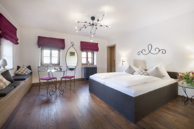 LAGE: im 1. Stock FRÜHER: Schlafzimmer der Bauersfamilie GRÖSSE: 23 qm - Zimmer 18 qm, Bad 5 qm FARBEN: Weiß, braun, grün AUSBLICK: Innenhof & Garten MERKMALE: Sehr helles und luftiges Zimmer, kleine Stufe ins Bad, großer Schrank, Doppelbett ohne Fußteil mit den Maßen 2,00m x 1,80m, großer Schreibtisch, antiker dunkler Eichenboden GEMÄLDE: Stillleben mit Melone von Alexander Dorofeev - Blumenbouquet J.K. 80 unbekannter Maler