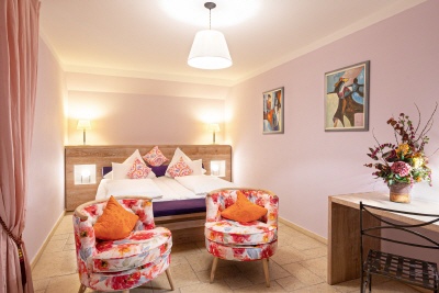 LAGE: im 1. Stock FRÜHER: Luftraum über der Scheune/Kuhstall GRÖSSE: 23 qm - Zimmer 19 qm, Bad 4 qm FARBEN: Weiß, rosa-lila-orange, verspielt AUSBLICK: zur Bäckerei MERKMALE: Modernes Designzimmer, Möbel Eiche gekalkt, 2 Sessel mit schmalem, langem Tisch vor Bett, Doppelbett ohne Fußteil mit den Maßen 2,00m x 1,80m, Ablage mit lila Polster, Schreibtisch, Ägyptischer Sandsteinboden GEMÄLDE: Sechs Noten Partituren - Zwei Gemälde "2 Damen" von Geeling