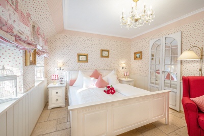 LAGE: im 2. Stock FRÜHER: Räucherkammer unterm Dach GRÖSSE: 34 qm - Zimmer 28 qm, Bad 6 qm FARBEN: Weiß, dunkelrot, viel Holz AUSBLICK: Garten MERKMALE: Romantisches und sehr gemütliches Zimmer mit Fachwerk und Dachbalken, Doppelbett mit Fußteil mit den Maßen 2,00m x 1,80m, kleiner Schreibtisch, kleiner Schrank, Holzboden aus antiker Eiche, Replika alter Räucherofen, Minibar, Couch geeignet als Extrabett, Bad mit Tageslicht GEMÄLDE: Drei Ölgemälde von Alexei Chustotchko